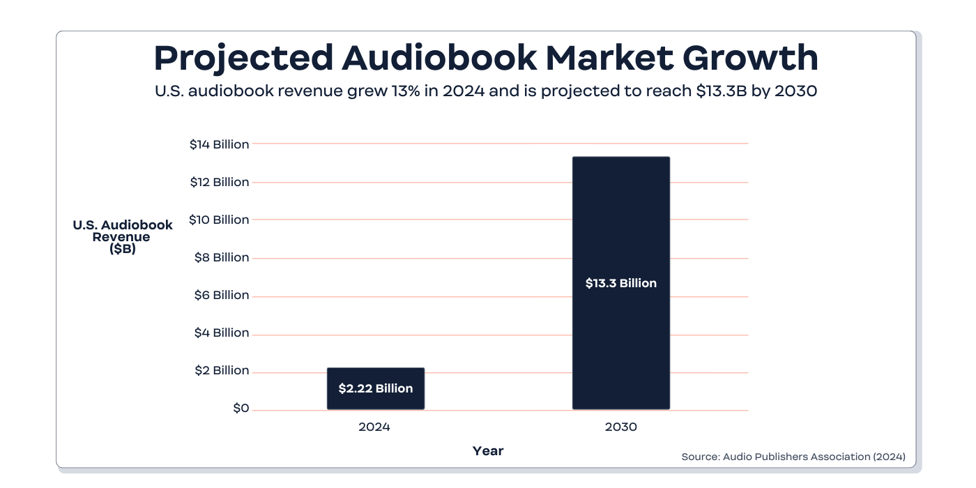 The audiobook industry has gone through a massive renaissance in the last decade, thanks to the ubiquity of smartphones and the rapid rise of listening platforms. According to a recent Audio Publishers Association survey, U.S. audiobook sales revenue skyrocketed to $2.22 billion in 2024, an incredible 13% increase over the previous year. By 2030, the audiobook market is expected to reach $13.3 billion in sales, with more than 1.75 billion active users.