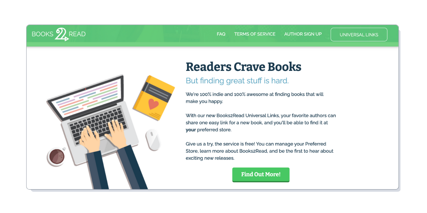 With a 100% focus on indie books, this site helps readers find new reads tailored to their specific interests. Its self-publishing services include new release notifications, author pages, book tabs, and more.