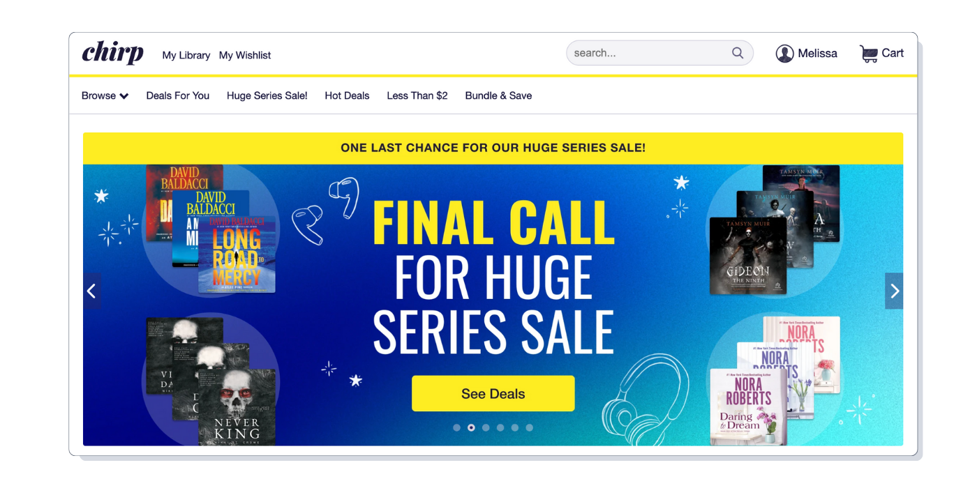 Chirp is BookBub’s audiobook retailer that lets authors promote discounts on their audiobooks. It offers many of the same features as BookBub’s promotions and is widely praised by indie audiobook authors. Author's Republic has a direct partnership with Chirp, so we can help you distribute to Chirp and submit your audiobook for special promotions on their site.