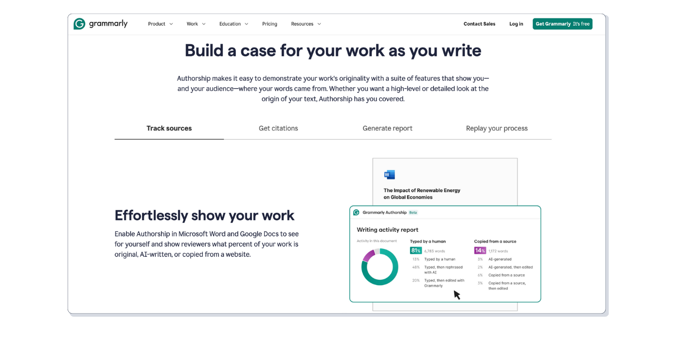 An extension of the popular writing tool, Grammarly, the Grammarly Authorship feature helps professional writers prove the originality of their work by tracking sources and documenting their writing and editing process – essential today in the age of AI.